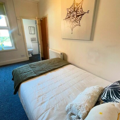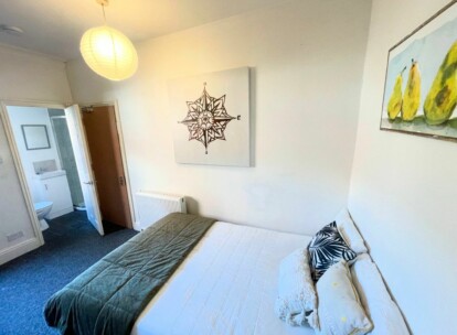 Room 2 is a large double room with an ensuite (shower, wash basin, toilet). It comes fully furnished with a double bed, wardrobe, drawers and bedside table.