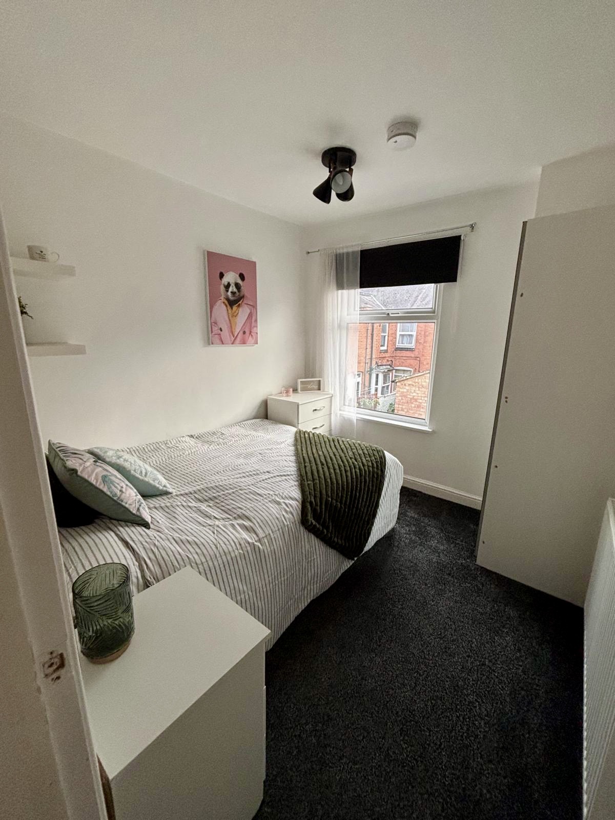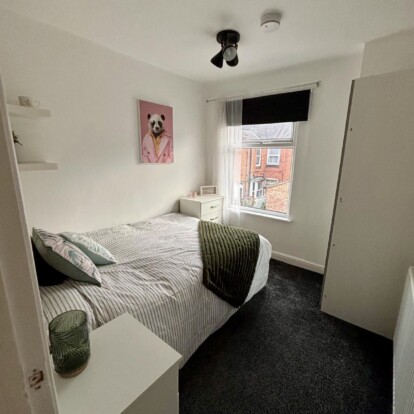 Room 4 is a bright and modern en-suite room with large windows. It comes fully furnished with a double bed, wardrobe, drawers, bedside table.
