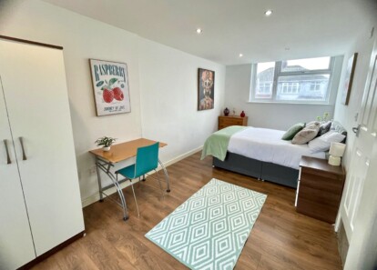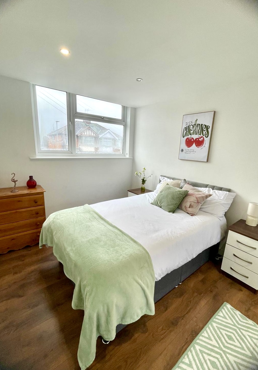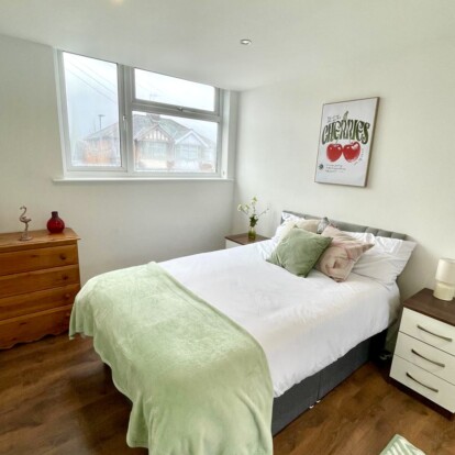 Room 1 is modern and well presented, offering a comfy and practical living space. Fully furnished with a double bed, wardrobe, drawers, and bedside table.