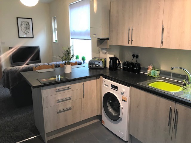 Fully equipped kitchen: cooker, oven, microwave, fridge, freezer, toaster, kettle, washing machine.